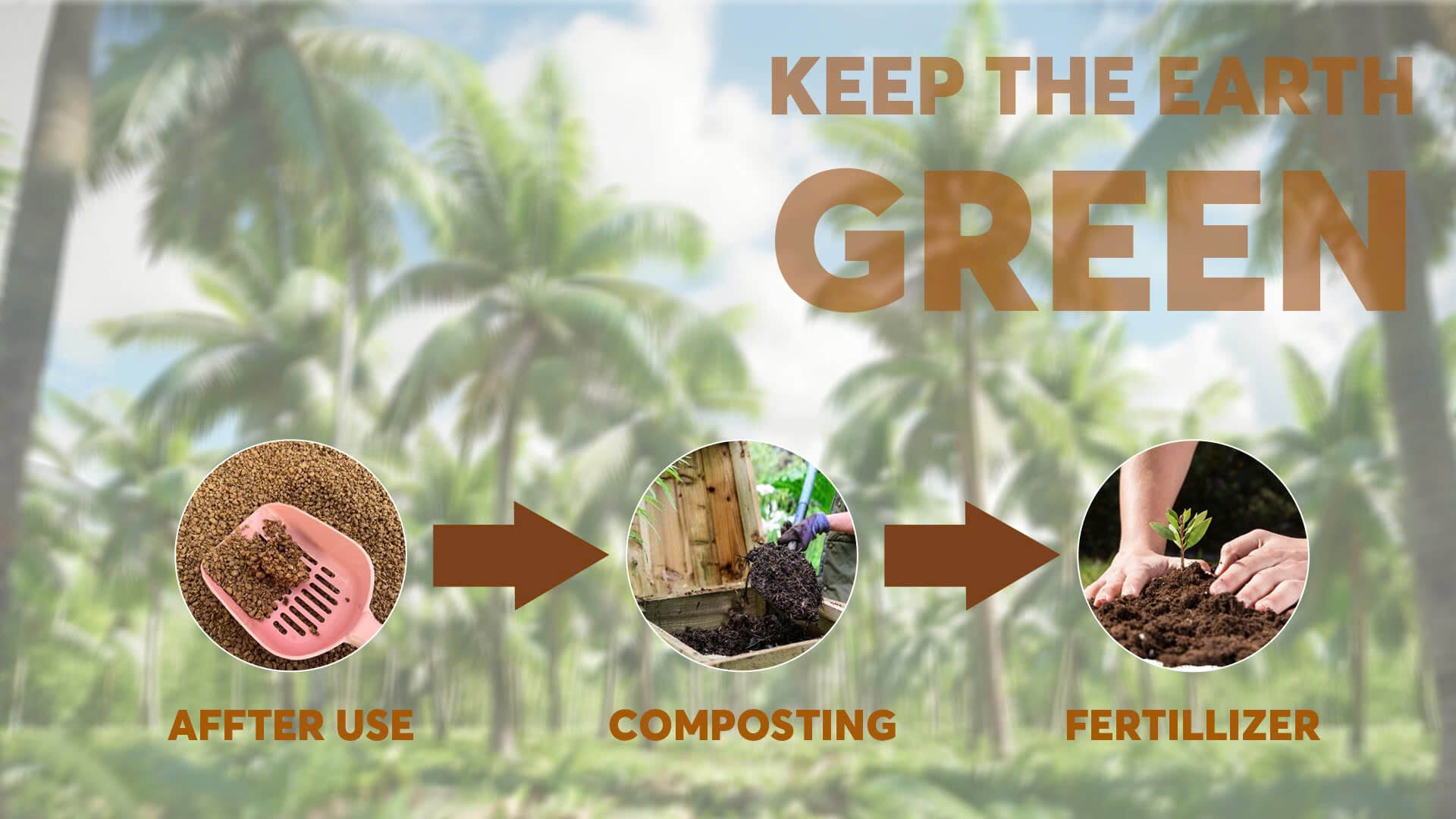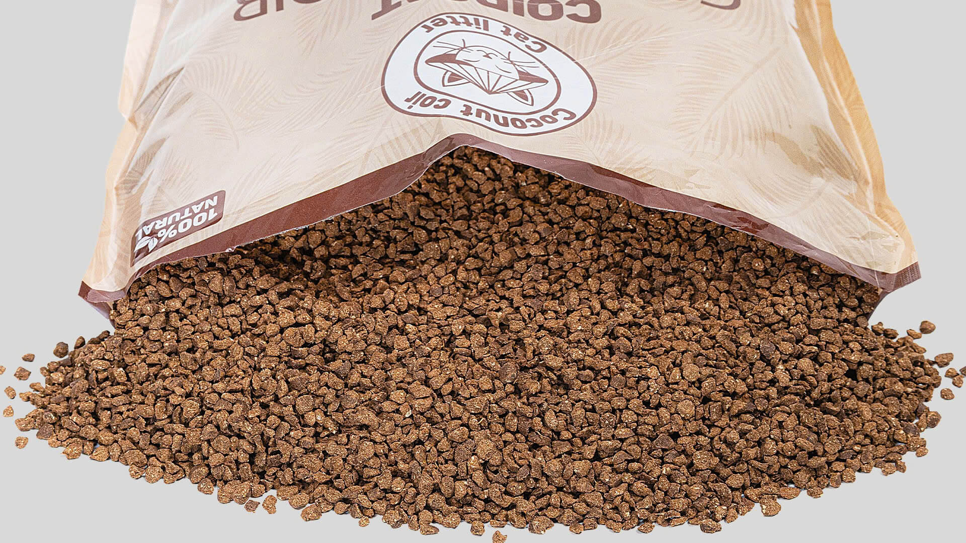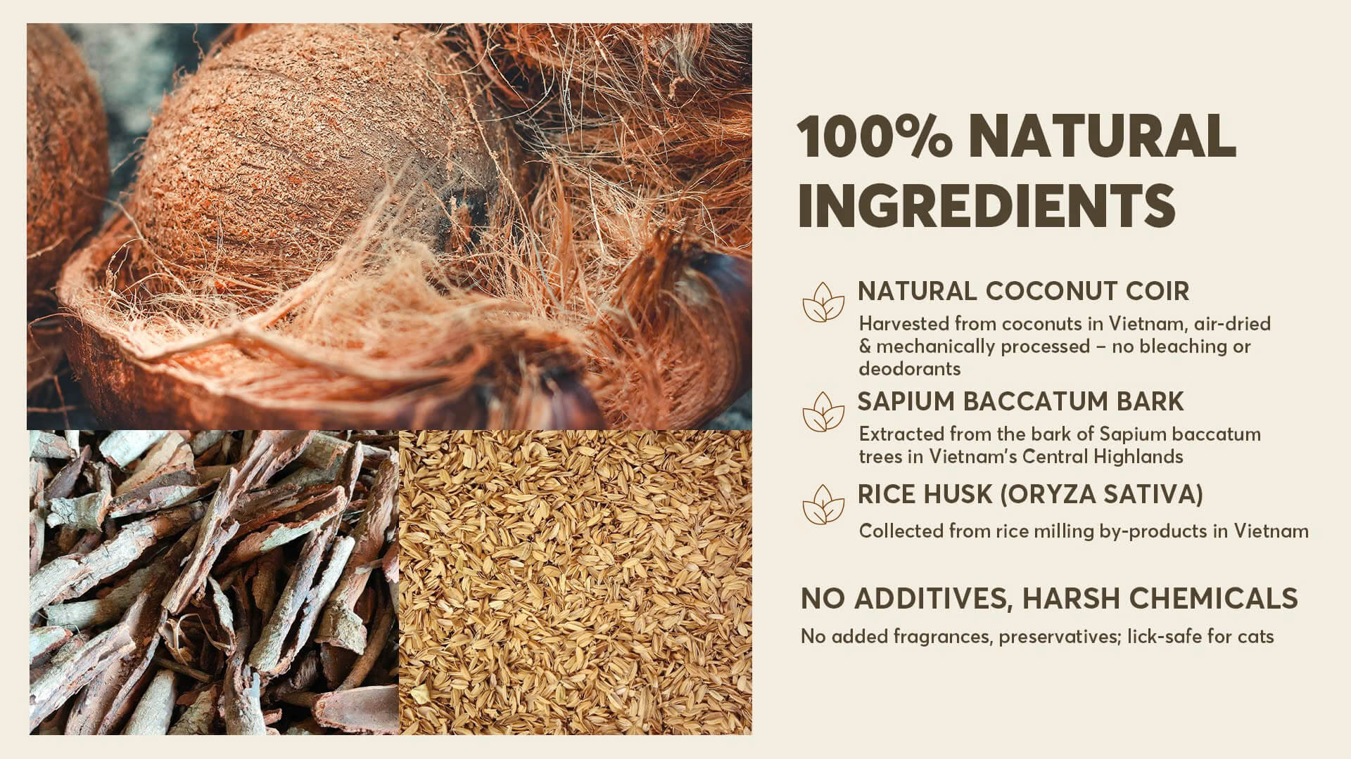 Coconut Coir Cat Litter offers environmental benefits through: Recycled and Sustainable Materials: Made from coconut husks, rice husks, and tree bark from Vietnam, utilizing agricultural byproducts.